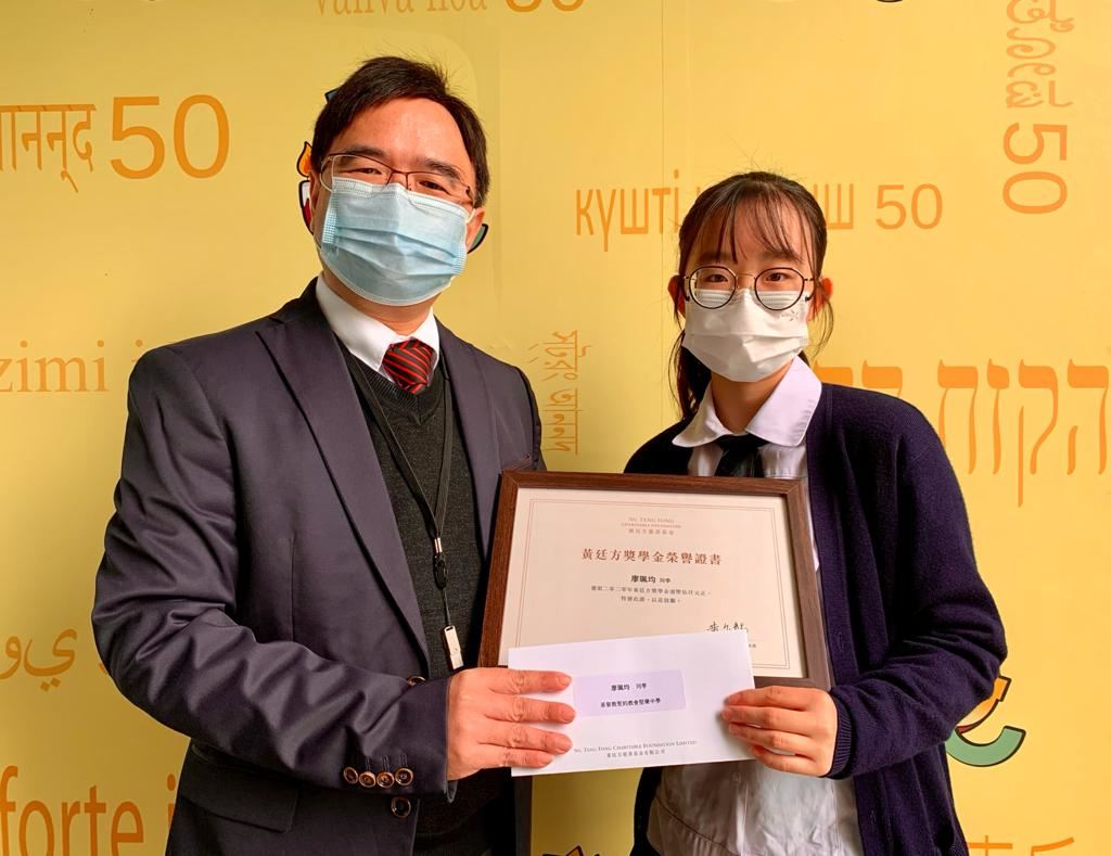 本校廖珮均同學(5A)品學兼優,獲黃廷方慈善基金頒發2020黃廷方獎學金HK$5000,可喜可賀。