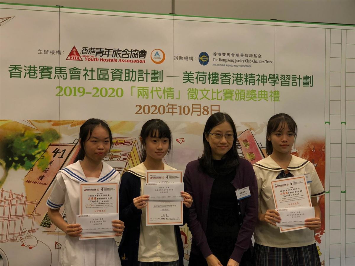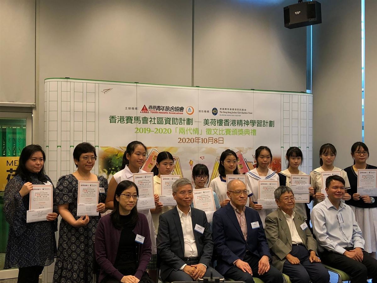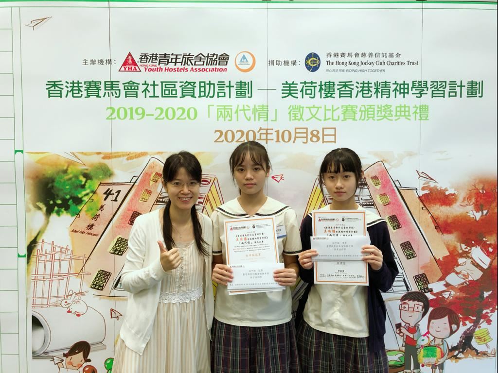 恭喜本校的吳子悅同學及黃彥澄同學分別獲得香港青年旅舍協會主辦的「2019-20 香港賽馬會社區資助計劃-美荷樓香港精神學習計劃『兩代情』徵文比賽」的初中組冠軍及季軍!另外,本校亦有4名學生獲得優異獎。