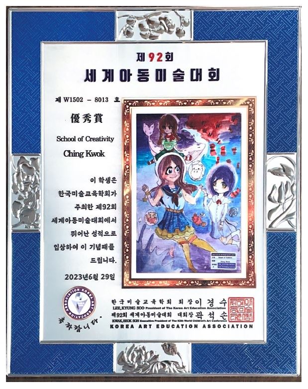 本校1D郭澄同學的作品於韓國「第92屆世界兒童美術大會」中獲得「全球優秀獎」(相等於全球亞軍)。同學的作品於韓國首爾永登浦藝術中心作大型的公開展覽。
