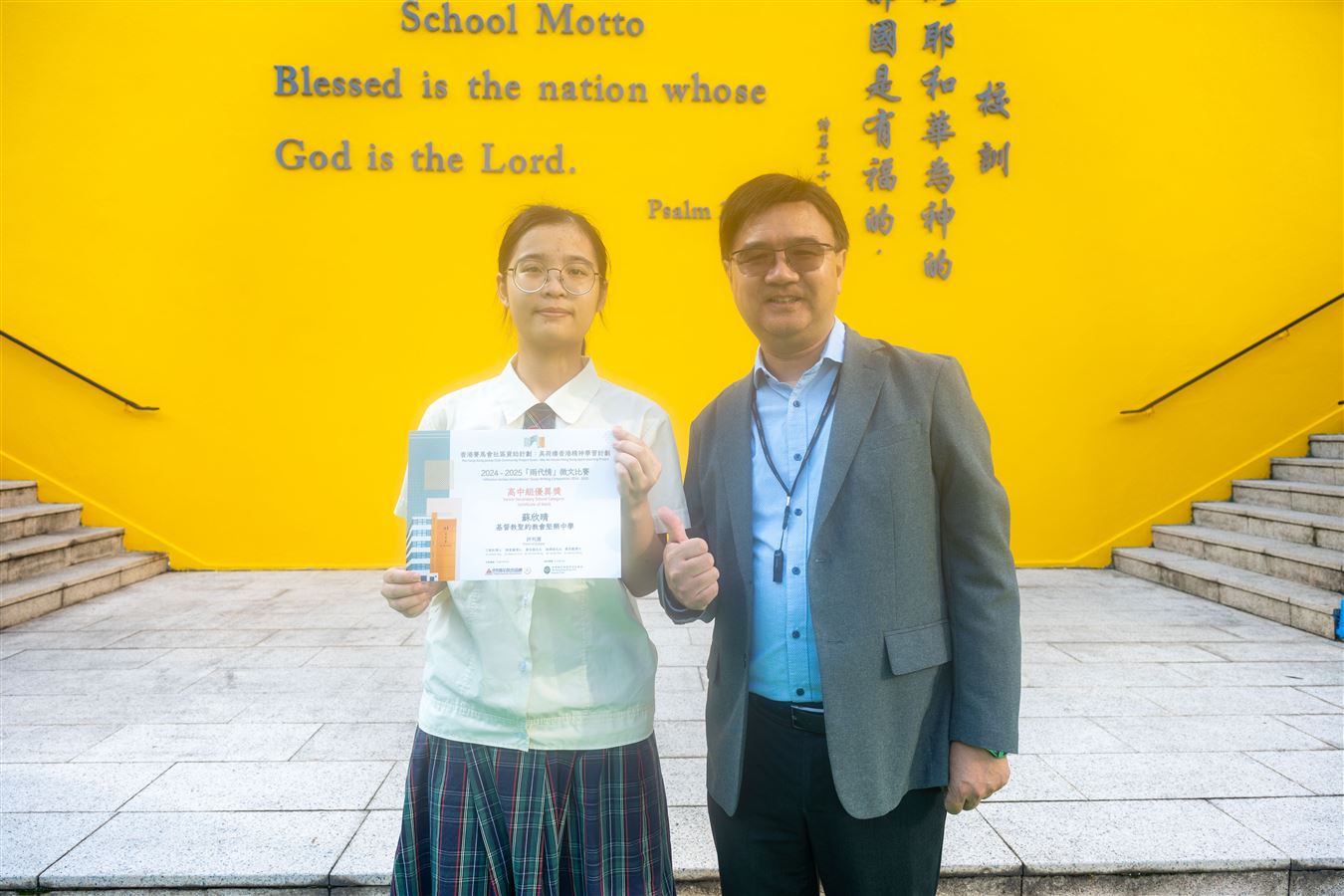 另外,6E蘇欣晴同學在「美荷樓香港精神學習計劃:兩代情徵文比賽」以〈人生的交叉點〉一文獲得優異獎,恭賀以上兩位得獎同學,盼望各位同學繼續努力,以有溫度的文字,發揮創作才華。